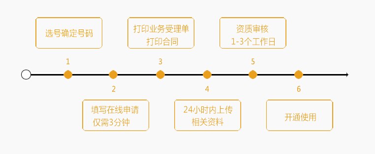 | 新号开通流程: 选择号码 → 填写申请表 → 准备资料(营业执照复印件、法人身份证复印件、申请表、服务协议、安全承诺书加盖公章) → 支付款项 → 号码开通使用。 | |||